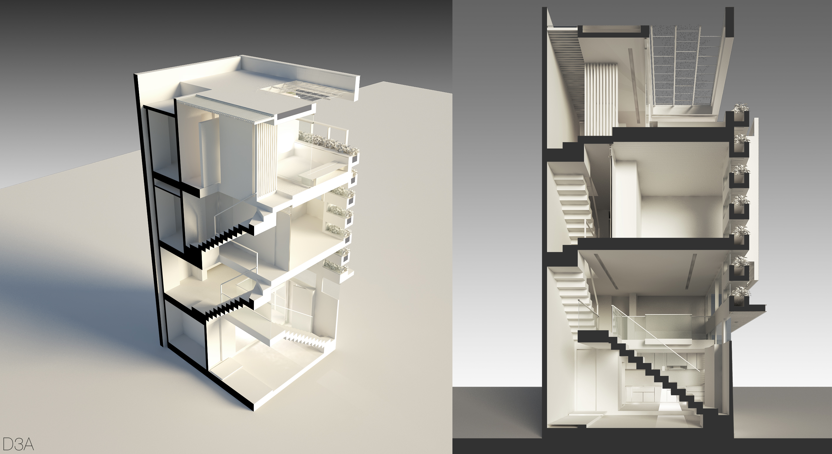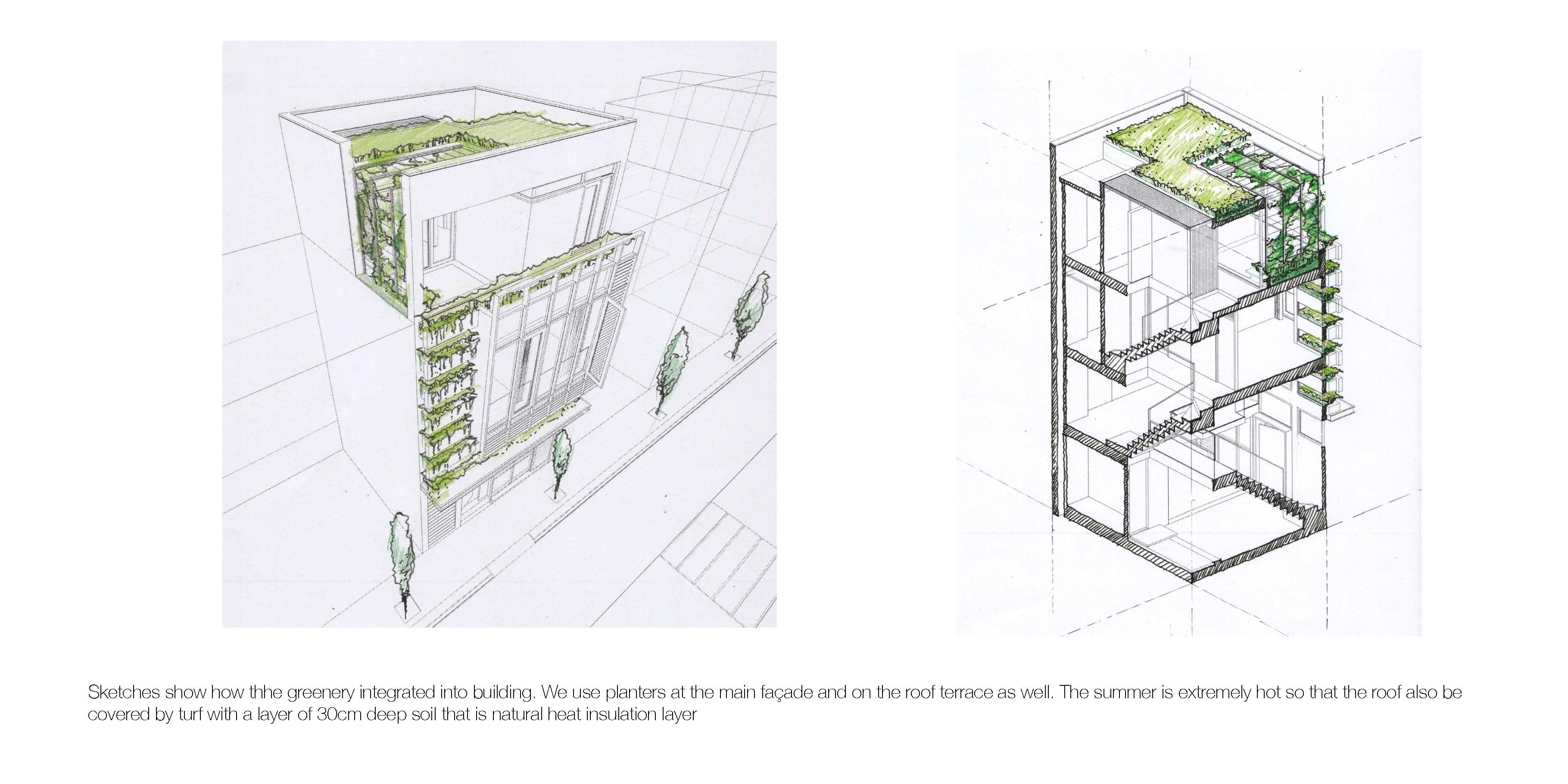 Minh họa phác tay cho ý tưởng đưa cây xanh gần hơn tới các không gian sử dụng ở tất cả các tầng. Cây bụi và hoa trang trí được lựa chọn để trồng trong các bồn, sân thượng và trên mái. Do đó tất cả các phòng đều trực tiếp nhìn tới các bồn cây, hoa trong khi đó lớp cây hoặc rau xanh trên mái còn là một lớp chống nóng tự nhiên. Trên bình diện đô thị các mái nhà xanh còn giúp cho việc ‘xanh hóa’ tốt hơn và giúp cho không gian sống đô thị thêm thân thiện với môi trường. Nhiều vườn trên mái sẽ có tác dụng nhiều hơn, có thể thấy Singapore như một ví dụ thành công điển hình trong chiến lược xây dựng hình ảnh một thành phố xanh.
