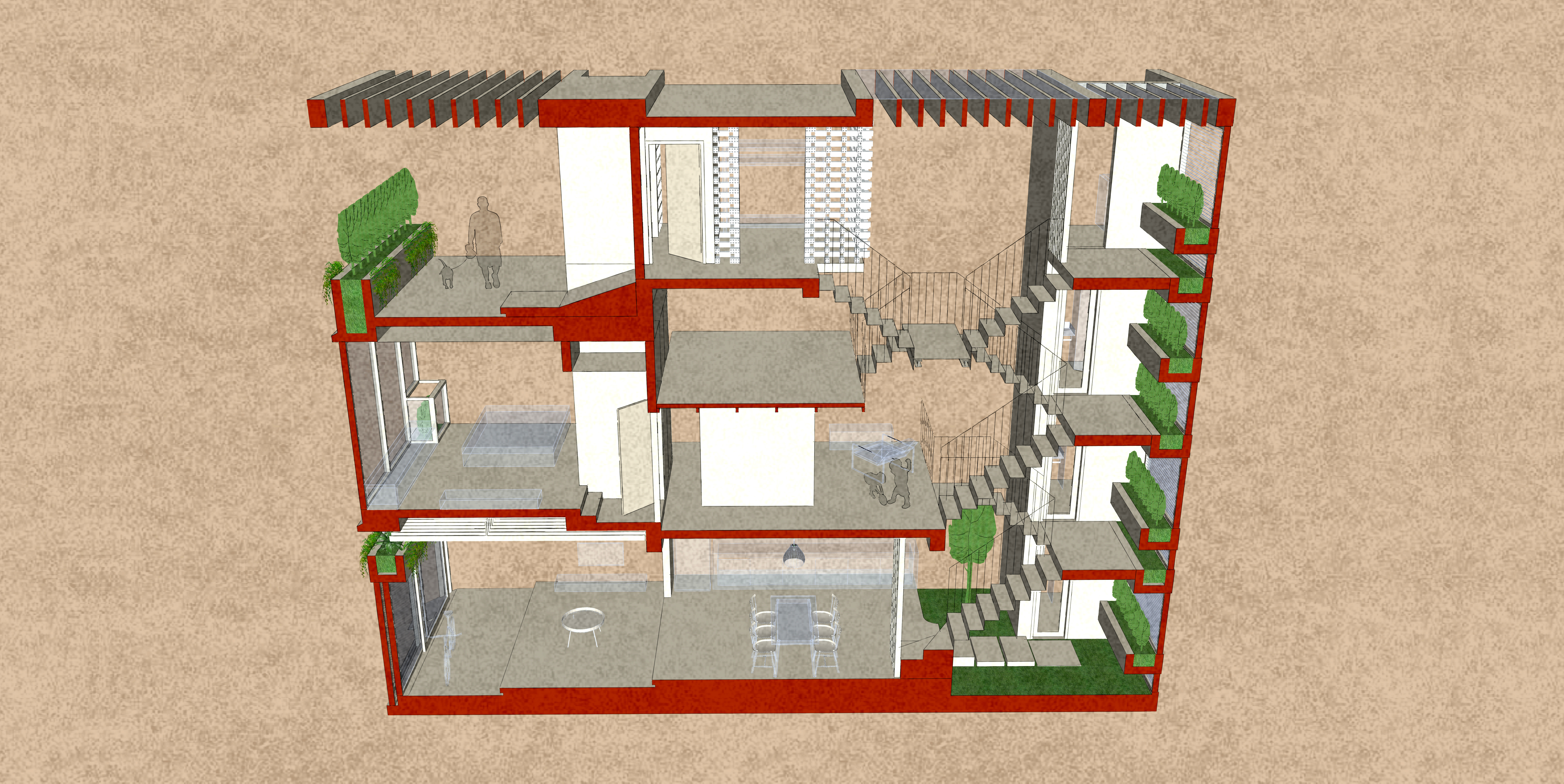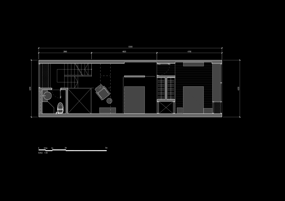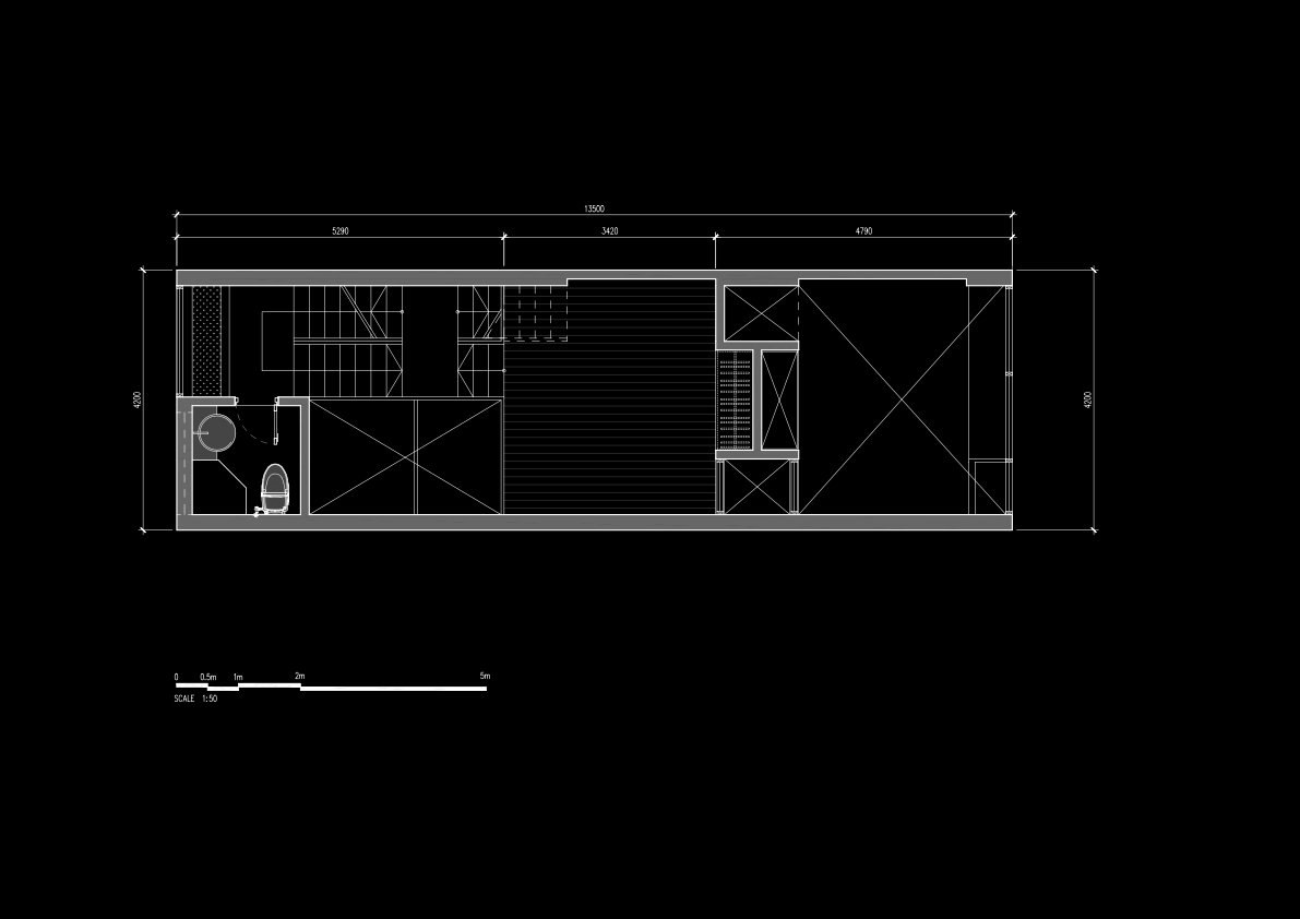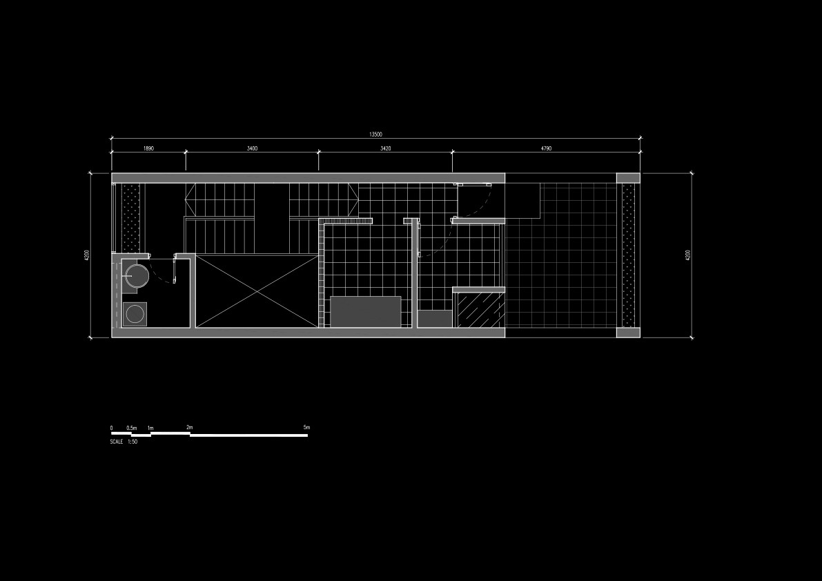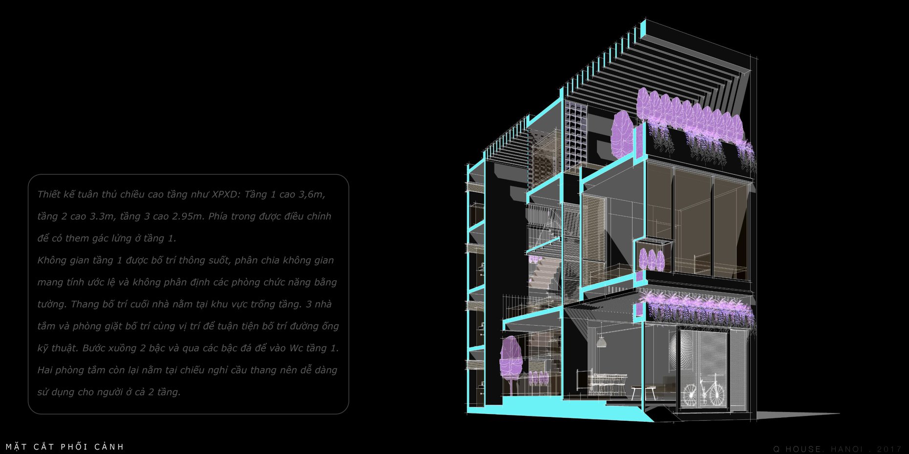 Ngôi nhà được thiết kế cho cặp vợ chồng trẻ mới cưới tại Hà Nội trên miếng đất 50m2. Kiến trúc tìm đến sự đơn giản hiện đại từ tổng thể khối nhà đến các chi tiết. Một khoảng thông tầng lớn trên có hệ lam bê tông và mái kính là ý tưởng chính của Q House. Nó mang ánh sáng tự nhiên, gió vào nhà nhiều hơn, gần gũi với sinh hoạt hàng ngày của người ở. Vườn cây, không gian mở, thông tầng, tầng lửng, thang nhiều vế,…còn giúp tạo ra một không gian mở và một lối sống đề cao sự giao tiếp và quan tâm chia sẻ của mọi người trong gia đình.
