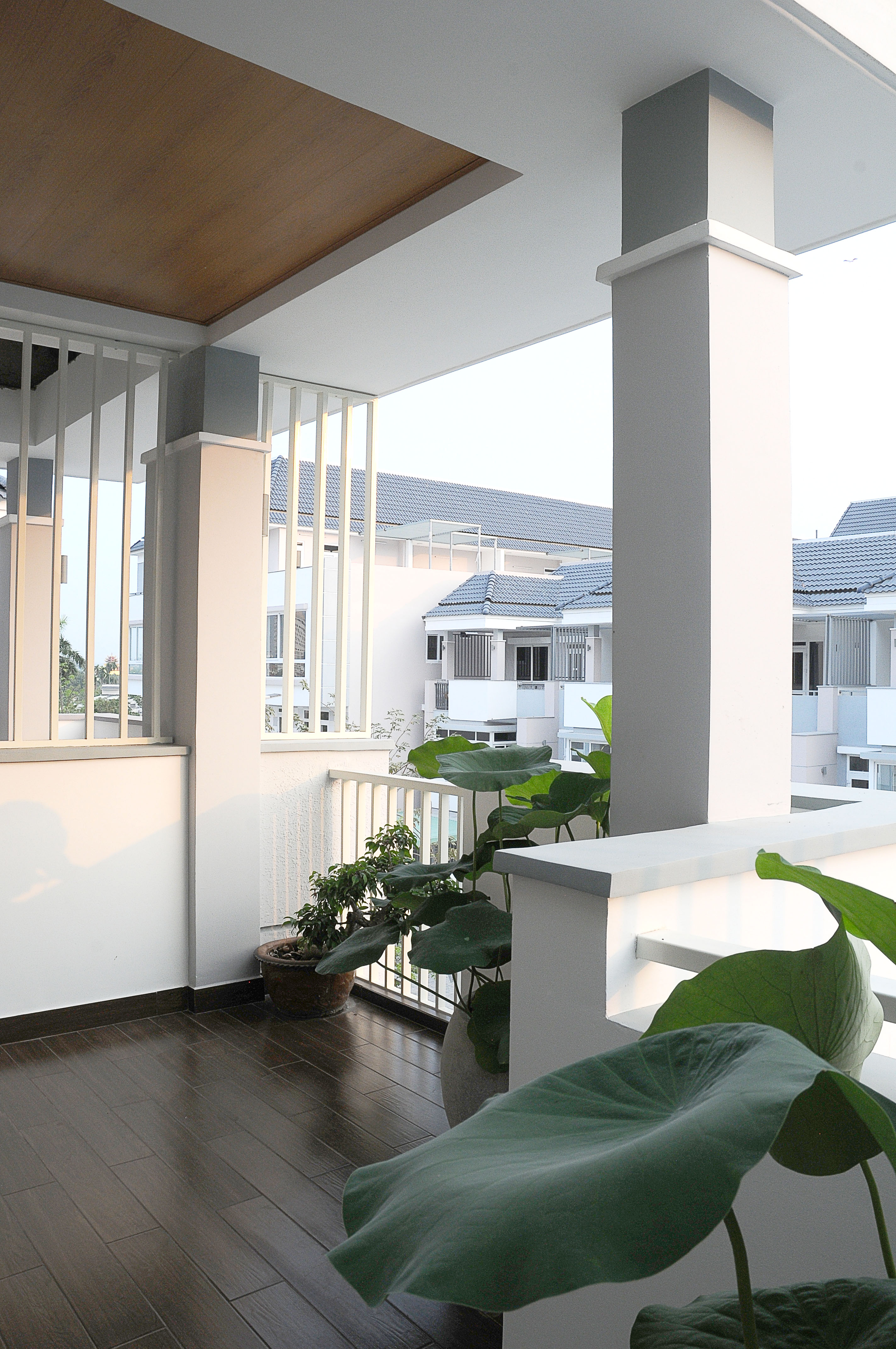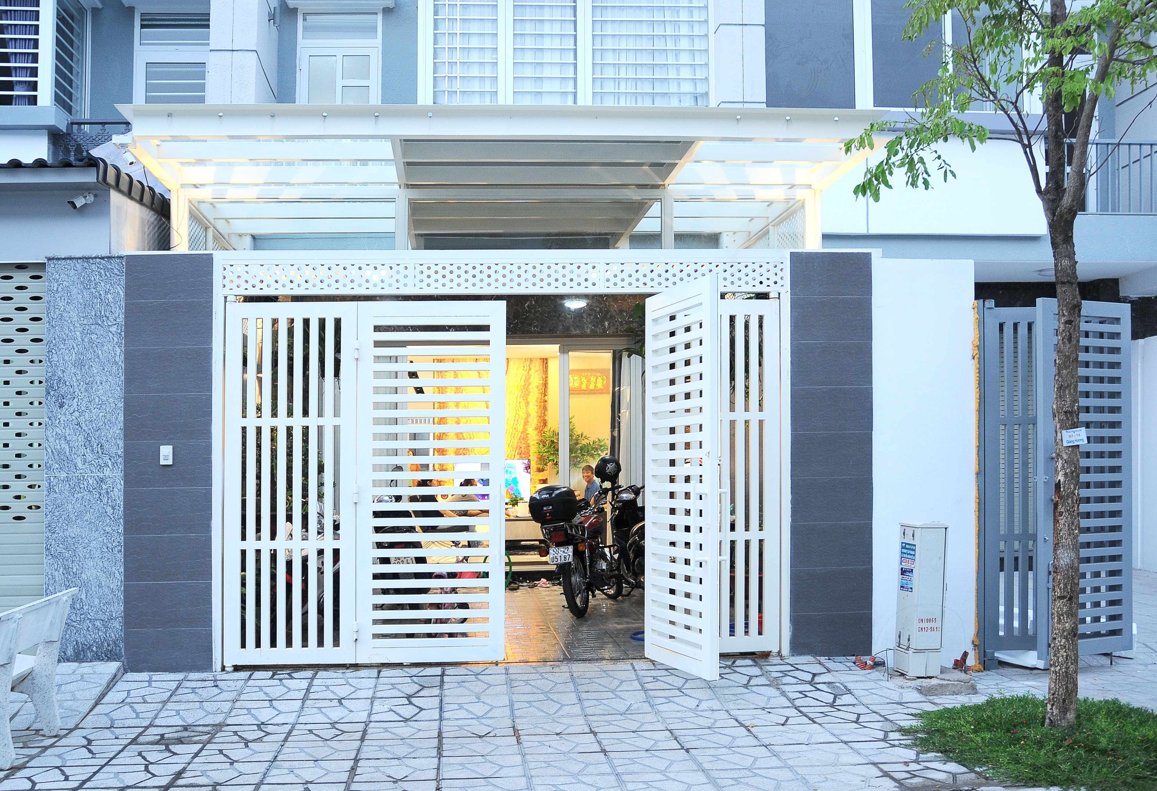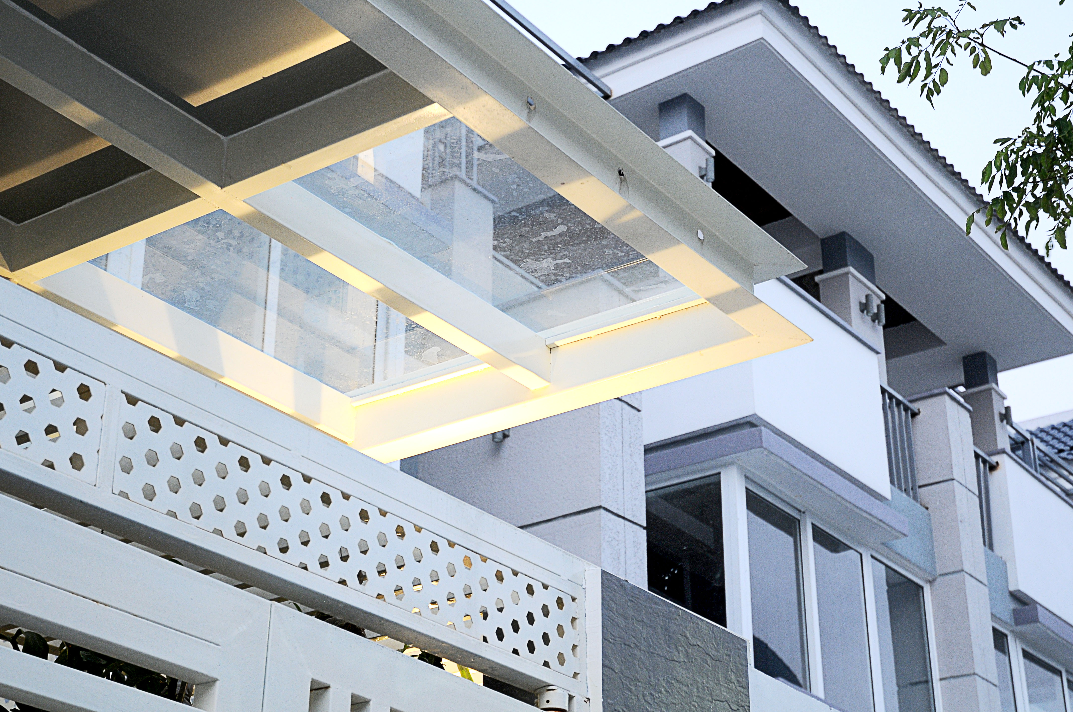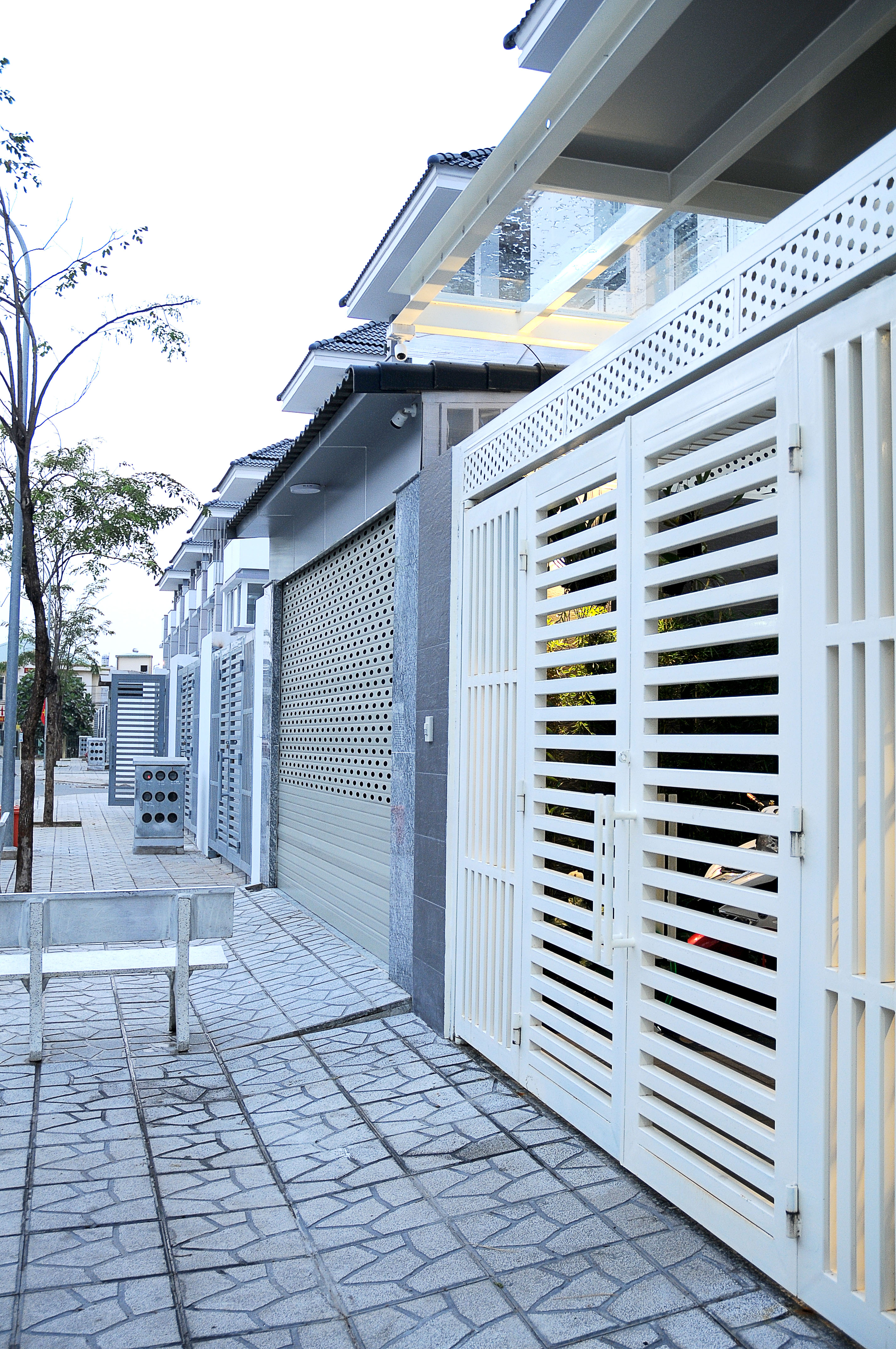 Hoàn thiện ngoại thất theo mẫu chung của toàn khu, chúng tôi vẫn được cho phép bổ sung mái kính ở sân. Thiết kế kết hợp đặc/rỗng của mái giúp đủ ánh sáng cho sân và phòng khách.