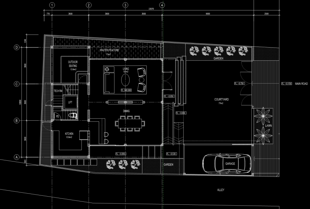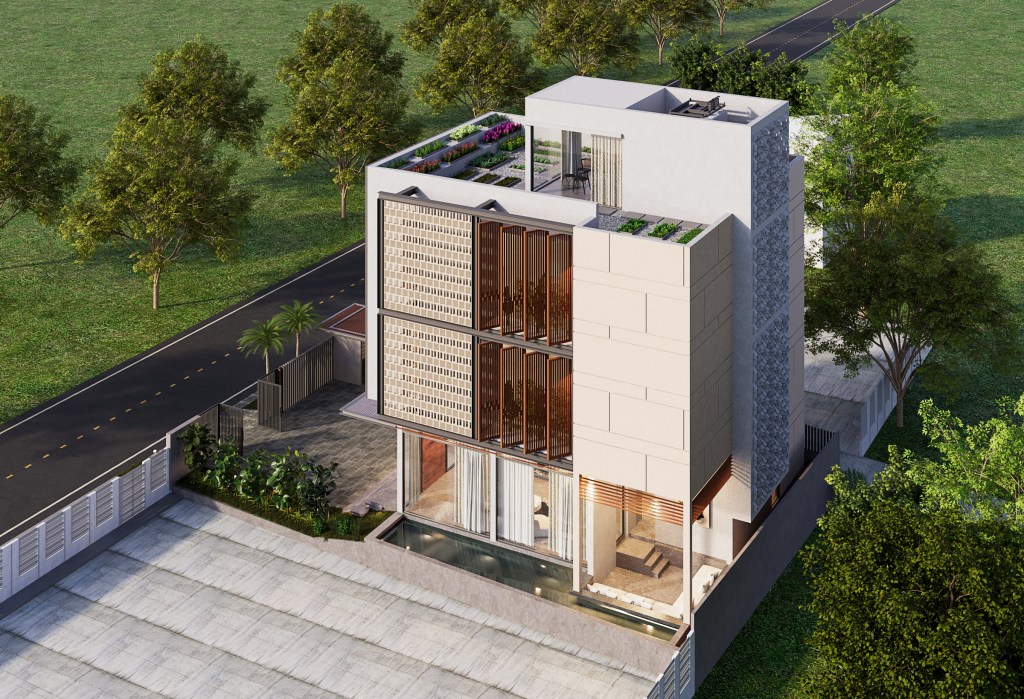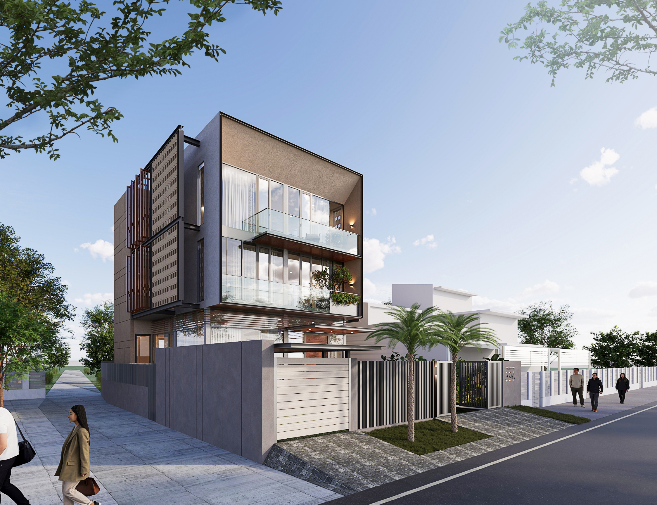 Thiết kế lùi hai mặt tiền Đông – Tây giúp không gian hài hòa hơn. Khoảng lùi này không chỉ tạo lớp đệm bảo vệ, giảm sự ảnh hưởng từ môi trường bên ngoài mà còn là nơi dành cho mảng xanh, cây hoa và các giải pháp che nắng. Nhờ khoảng lùi lớn, phần sân trước rộng rãi có thể bố trí gara và tiểu cảnh, tăng tính kết nối giữa kiến trúc và thiên nhiên.