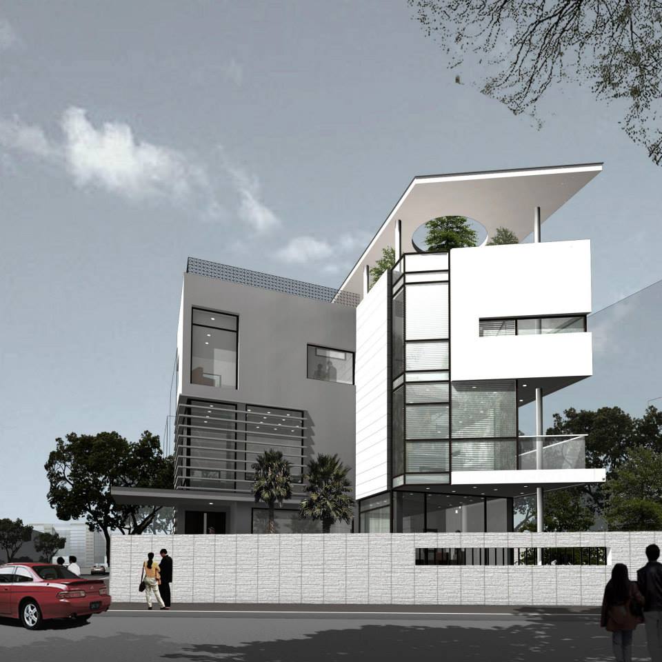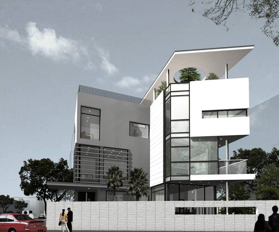 Tọa lạc tại vị trí góc hai mặt tiền trong khu đô thị cao cấp ven Hồ Tây, căn biệt thự hiện đại nổi bật với hình khối kiến trúc mạnh mẽ và tinh thần tối giản. Thiết kế tập trung vào sự tương phản rõ nét giữa những mảng tường trắng tinh khiết và hệ khung nhôm kính đen, tạo nên vẻ ngoài thanh lịch, sắc sảo và đậm chất đương đại.
